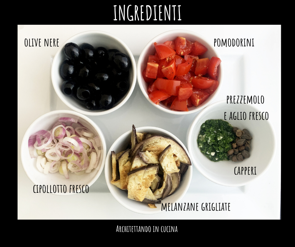 Mettere a bollire l’acqua per la pasta (almeno 4 litri) e cominciare a preparare il sugo. Tagliare le melanzane grigliate a listarelle e condirle leggermente con olio e sale. Lavare i pomodorini, tagliarli in 4 e condirli con olio, sale e pepe. Scolare le olive nere dalla salamoia e dividerle in 2. Pulire il prezzemolo e tritarlo finemente. Fare lo stesso con l’aglio fresco. Dissalare i capperi in acqua corrente e tritarli anche questi.