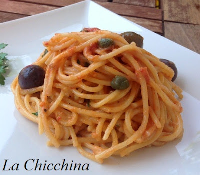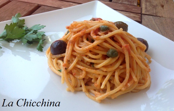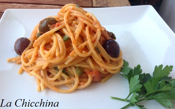 Preparazione: in un largo tegame scaldare l’olio con l’aglio schiacciato e aggiungere poco prezzemolo tritato. Inserire le acciughe e farle disfare a fuoco dolce: aggiungere la polpa di pomodoro, le olive, i capperi e quindi le spezie, il sale, il peperoncino e l’origano a piacere.