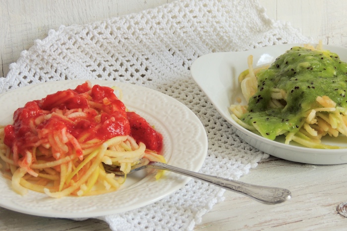 Un piatto originale e leggero. Golosissimi spaghetti di frutta conditi con salsa di fragole e kiwi. Mele croccanti tagliate a spirale insaporite con deliziose salse di frutta frullata. Una vera delizia per chi segue un’alimentazione vegana o vegetariana, oppure semplicemente un’idea alternativa per portare la frutta in tavola. L’ideale per tutta la famiglia, ospiti compresi