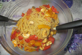 125 gr spaghetti di riso integrale, 1 peperone giallo, 1 peperone rosso, 5 pomodorini, 1 manciata di anacardi, capperi, aglio, curry, sale integrale, olio extravergine d’oliva.