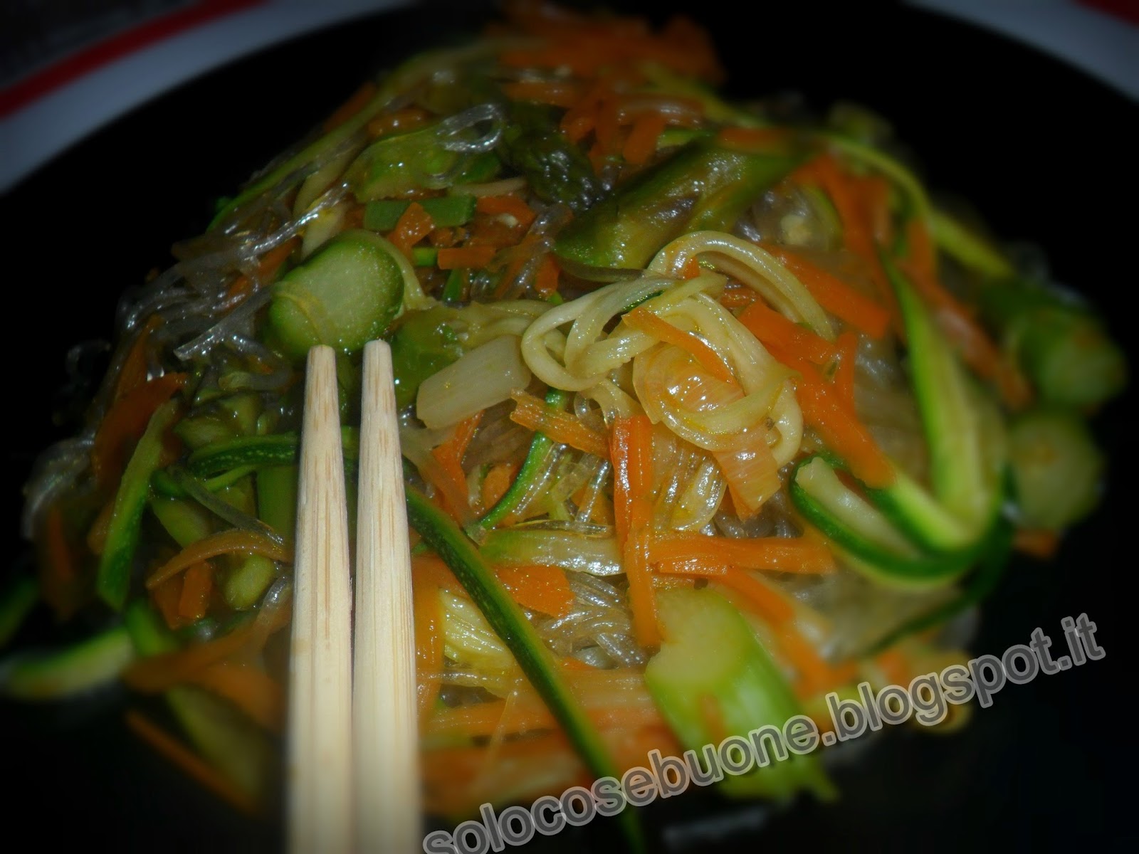 Un primo piatto dal sapore orientale, senza tante calorie, adatto anche per chi soffre di intolleranze alimentari perchè gluten free. Per preparare gli spaghetti di soia alle verdure io ho scelto carote, zucchine ed asparagi, ma possiamo utlizzare le verdure che più ci piacciono.