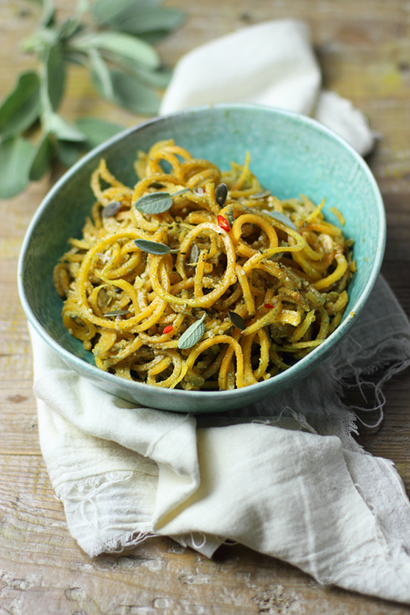 Oggi spaghetti di zucca, un classico che sarà anche l’occasione per salutare questo ortaggio per lasciare spazio alle verdure primaverili. Il piatto è molto semplice, non richiede certo spiegazioni. L’unica cosa su cui ci si può dilungare è il condimento. A me il pesto di salvia piace moltissimo, lo mangio spalmato su crostini caldi e soprattutto lo adoro sulla polenta grigliata, lo faccio spesso e devo dire che piace sempre molto, soprattutto in aggiunta a delle alghe marinate con olio e limone, è un delizioso antipasto!