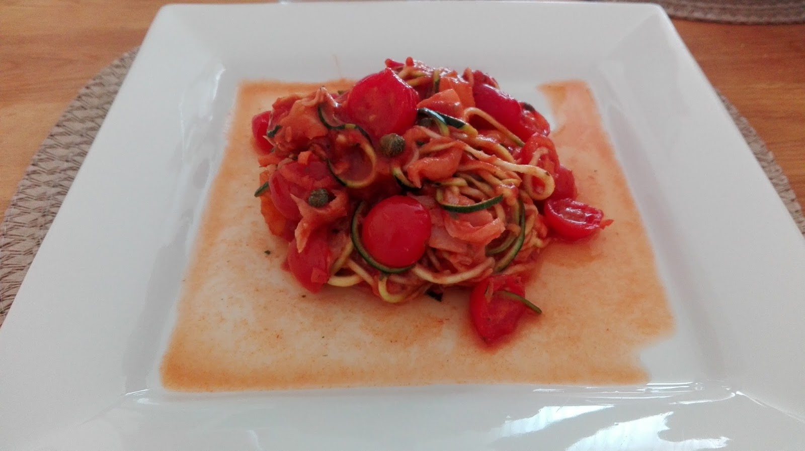 Tagliamo i pomodorini e lasciamoli cuocere per un minuto con un filo d’olio in una padella capiente , aggiungiamo poi gli spaghetti spiralizzati , mescoliamo con i pomodorini e aggiungiamo di volta in volta la salsa al pomodoro .