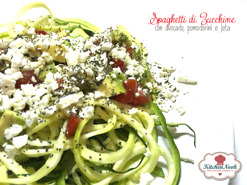Sono 10 giorni che non tocco carne di animale terrestre (se così si puù dire), solo pesce un paio di volte. Non so se riuscirò mai a diventare vegetariana ma già così mi sembra un buon compromesso per tenere fede ai miei principi etici e morali nei confronti degli animali sfruttati negli allevamenti intensivi e tutte le problematiche che girano intorno a questo inferno. Per non parlare poi della salute che a mangiare vegetariano c’è solo da guadagnarci. Continua così il mio percorso di proposte vegetariane qui sul mio blog. Oggi con una freschissima spaghettata di zucchine tutta al crudo, con avocado, pomodorini e la mia amata feta.