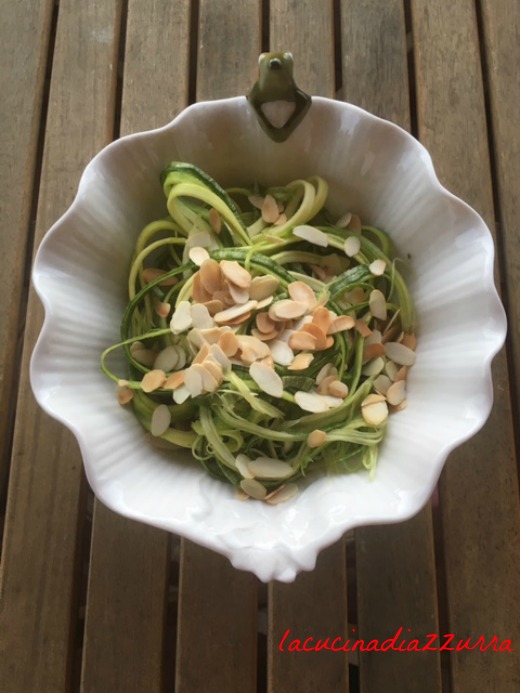Li disposi nel mio ciotolino con la rana che adoro alla follia (il verde della rana si sposava alla perfezione con le zucchine) e mi lasciai guidare dal palato aggiungendo sale, olio, limone e senape. Li assaggiai, mancava sempre qualcosina….e fu allora che mi vennero in mente le lamelle di mandorle, così, le tostai un attimo e terminai la composizione. E’ stato uno dei piatti più apprezzati di quella sera e di ogni volta che poi l’ho riproposto!!