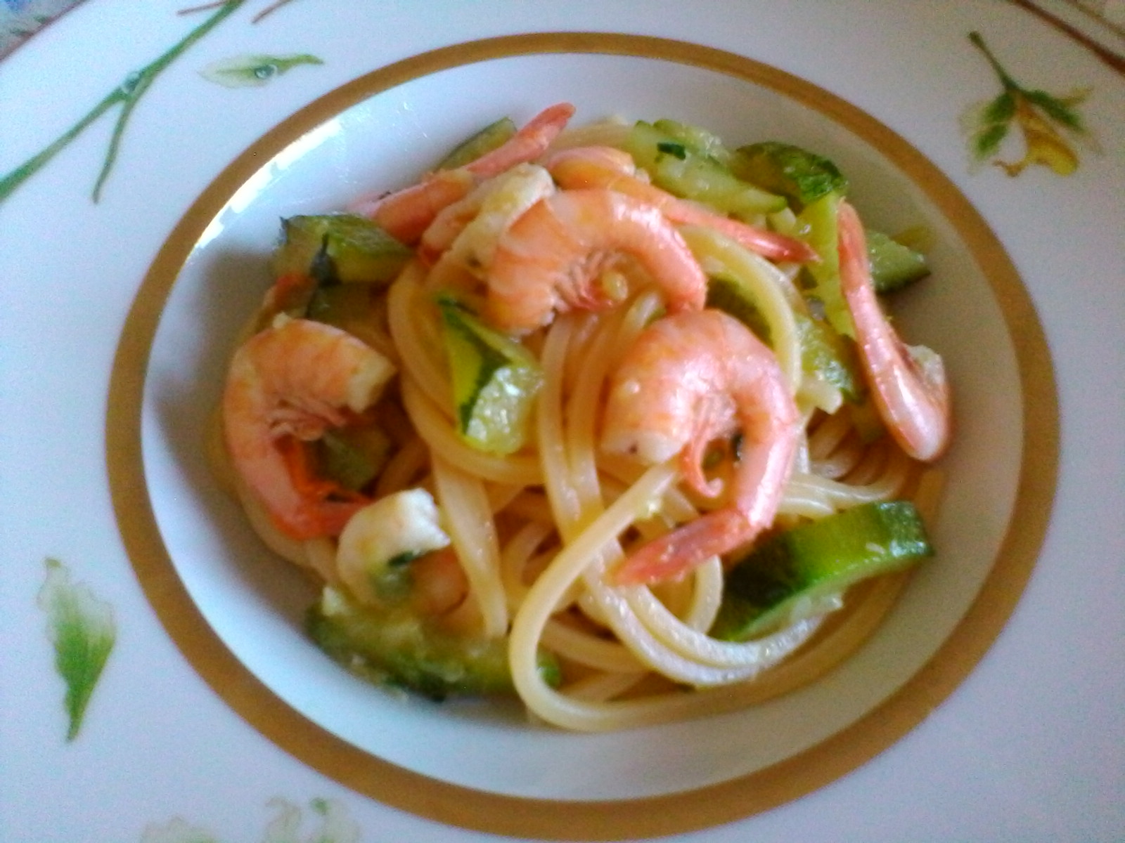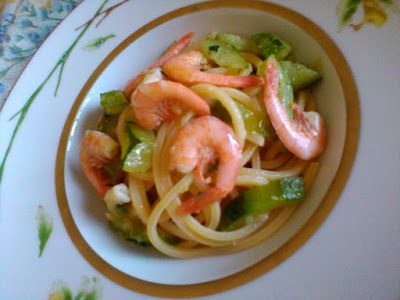 Cuocete in abbondante acqua salata gli spaghetti e una volta scolati versateli nel sugo di gamberi e zucchine facendo amalgamare il tutto per qualche istante e aggiungendo dell’acqua di cottura se necessario.