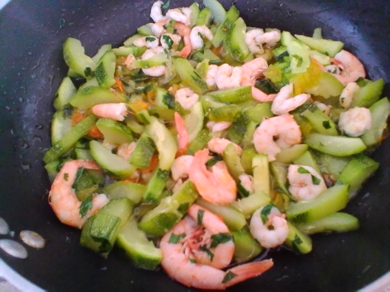 Mettete in un’altra padella olio, aglio e peperoncino, rosolate per pochi minuti a fuoco vivace e poi aggiungete i gamberi insieme al sughetto arancione filtrato. Unite le zucchine precedentemente lavate, spuntate e tagliate sottili, il prezzemolo tritato e lasciate cuocere il tutto per alcuni minuti. Regolate di sale e pepe e togliete lo spicchio d’aglio.