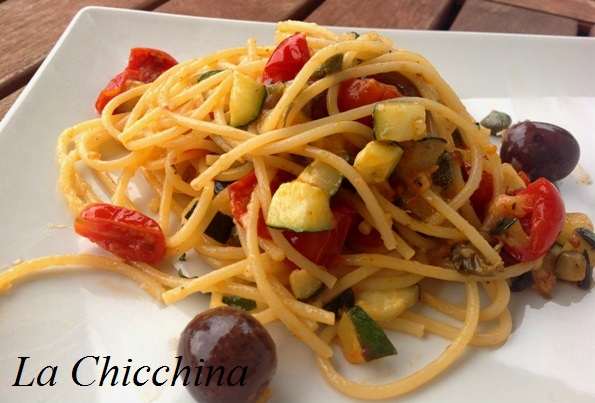 Preparazione: mettere in un tegame l’olio con l’aglio tritato, aggiungere un trito di prezzemolo e la zucchina lavata e tagliata a cubetti. Inserire ora i pomodorini divisi a metà e le olive, salare, pepare ed aggiungere l’origano.