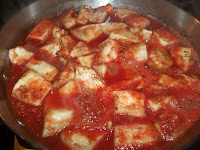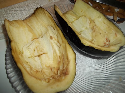 A metà cottura versateci la parte interna della melanzana preferibilmente tagliata a cubetti.