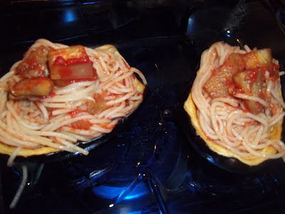 Ora non vi resta che preparare le nostre “carrozze” ; riprendete le melanzane messe da parte e disponetele in una pirofila unta di olio; adagiatevi sopra gli spaghetti e spolverizzate di origano.