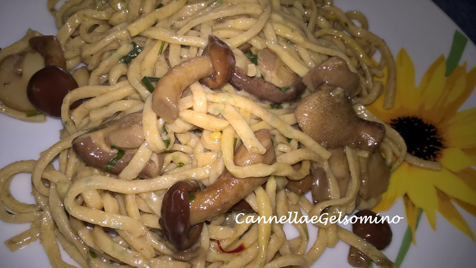 Cuocete gli spaghetti in abbondante acqua salata e saltateli con i funghi.