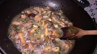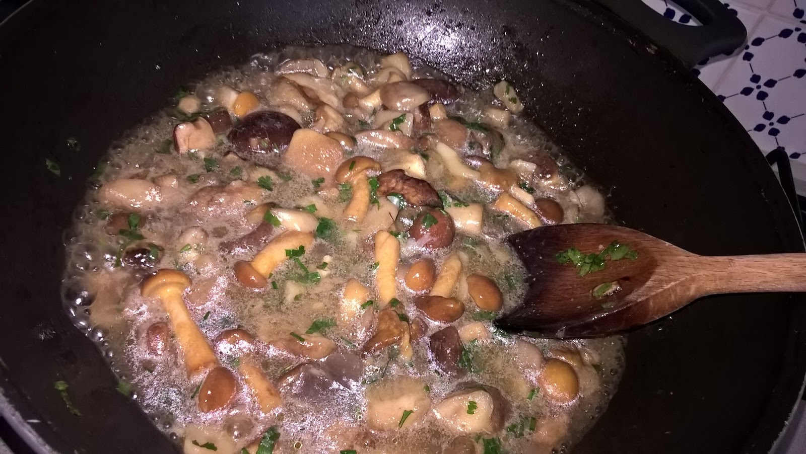Preparate un soffritto con due spicchi d’aglio, olio extravergine d’oliva, prezzemolo tritato, peperoncino e i funghi. Sfumate con mezzo bicchiere di vino bianco.