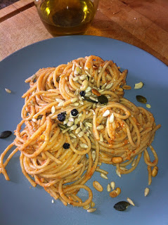 Condire gli spaghetti con il sugo di lenticchie rimasto e il pesto preparato. Aggiungere un filo d’olio crudo e finire con una manciata di semi oleosi.