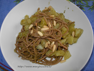 120 gr spaghetti integrali di farro, 3 patate medie, 2 mazzetti di basilico, 50 gr pinoli, olio extravergine d’oliva, sale integrale.