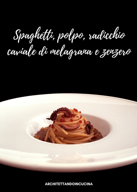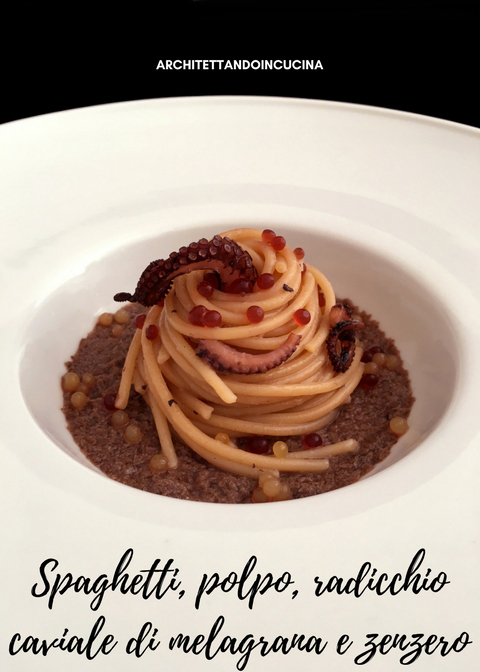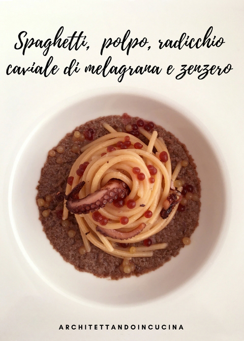 Quindi il piatto definitivo è polpo bollito con acqua e senza, questo perché il polpo cotto senz’acqua, rilascia i suoi succhi, molto intensi e saporiti, ma difficilmente più di un bicchiere, così per essere sicura di avere liquido sufficiente per la marinatura ho fatto anche un polpo bollito in acqua. Dopo averlo cotto e raffreddato nel suo liquido, l’ho tagliato a pezzettini e fatto rosolare con aglio tritato finemente e olio extra vergine di oliva, ho aggiunto il liquido di cottura del polpo e fatto mantecare gli spaghetti. A fondo piatto una crema di radicchio rosso: solo radicchio sbollentato e messo nel ghiaccio per preservare il colore e l’amarognolo, condito con olio sale e pepe e frullato. Ho aggiunto il caviale ottenuto per sferificazione dal succo della melagrana e dal succo di zenzero con l’agar agar. Poi per inserire una nota croccante, ho grigliato i tentacoli in una padella antiaderente, finché non hanno fatto la crosticina. Ho assemblato il tutto e questo è il piatto finito.