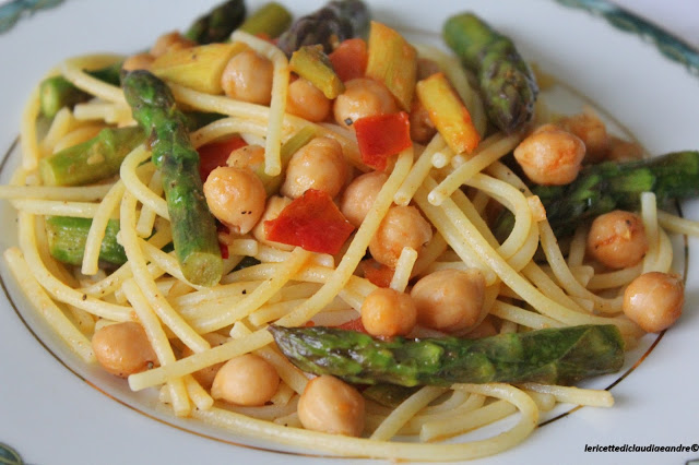 Spaghetti senza glutine con asparagi, ceci e pomodori