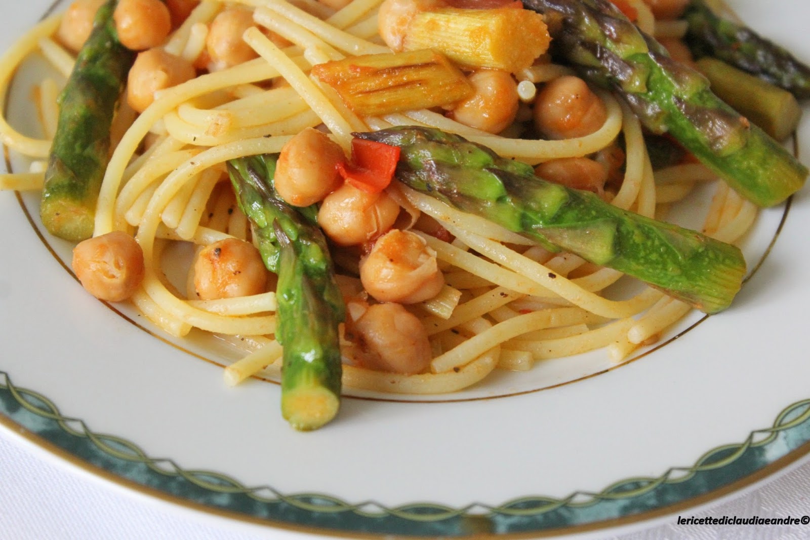 Spaghetti senza glutine con asparagi, ceci e pomodori