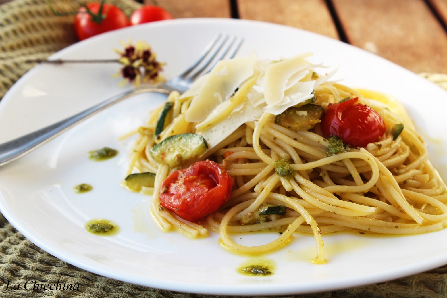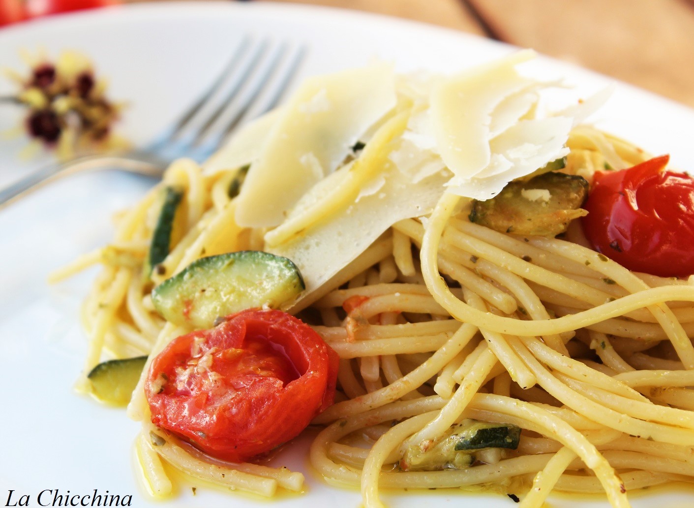 La ricetta di cui vi parlerò oggi è un chiaro esempio: tre zucchine, un pugno di pomodorini succosi, un pochino di pesto e sottili scaglie di parmigiano per terminare il piatto, oltre, naturalmente, ad un filo di olio a crudo di ottima qualità, ed ecco pronto un primo leggero e gustoso.