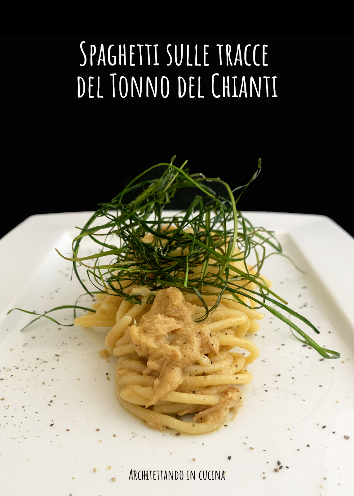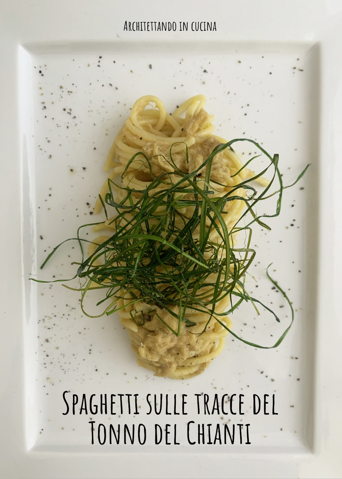 Nel piatto, il sapore del Tonno spicca, ma restano presenti i profumi delle erbe aromatiche chiantigiane e delle spezie. Il sugo è avvolgente sullo spaghetto, morbido e saporito. Mancava una nota croccante che ho reso con le foglie dell’aglio fresco fatte a fili sottilissimi e fritte per pochi secondi. L’aggiunta è essenziale, perché la foglia, mantiene un delicatissimo sapore di aglio che sgrassa, spinge il sapore e dona croccantezza, rendendo l’insieme gradevolissimo al palato.