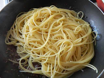 Spegnere e mettere da parte. Cuocere gli spaghetti e lasciandoli al dente scolarli e metterli direttamente nella padella con il sugo di tonno e patè.