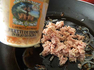 lasciamo appassire dolcemente la cipolla, poi aggiungere prima il tonno