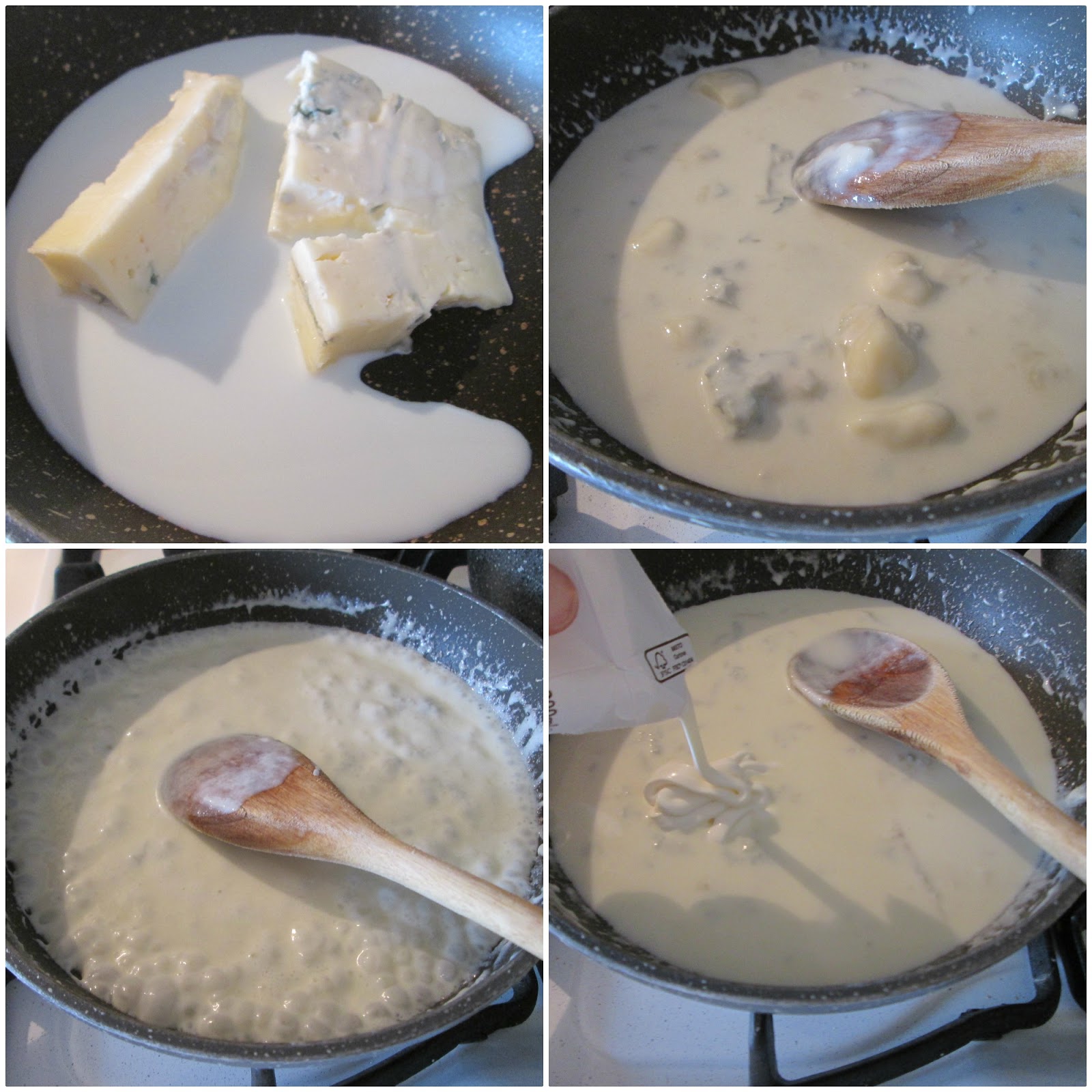 - Fate sciogliere ora il gorgonzola in un tegame con l’aggiunta di poco latte, quando sarà fuso aggiungete un pochino di panna da cucina fino ad ottenere una salsa densa e cremosa e spegnete la fiamma