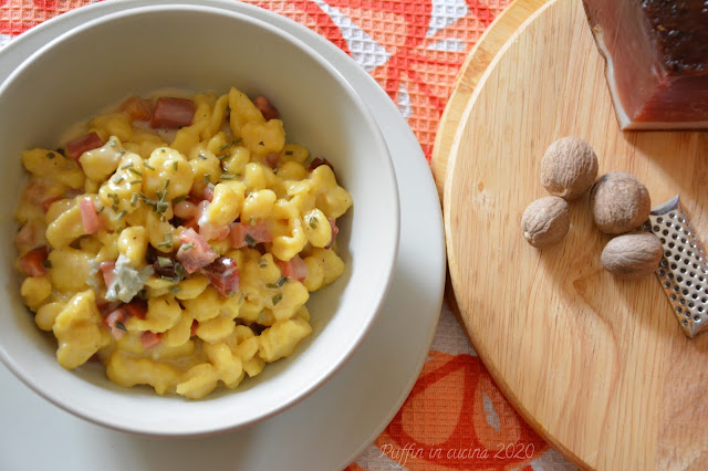 Scolare gli späztle e saltarli in padella con lo speck e gorgonzola.