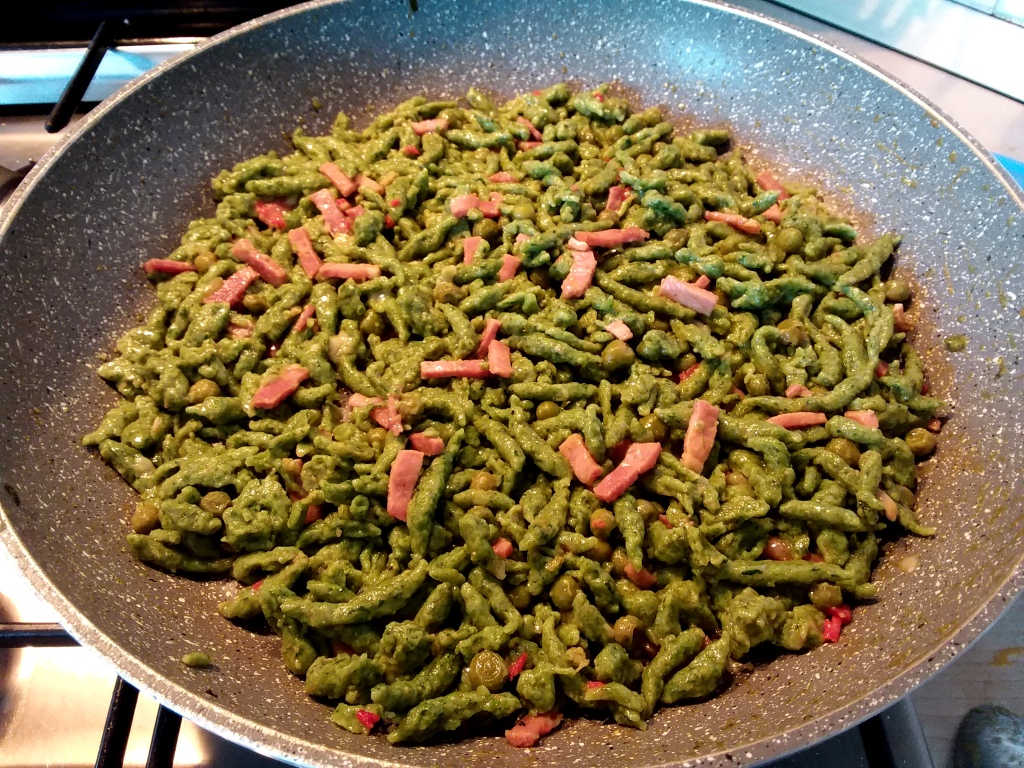 | Spätzle verdi agli spinaci con Prosciutto di Praga, Piselli e Pecorino al Tartufo |