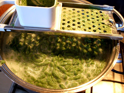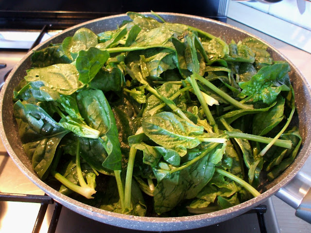 - Dedichiamoci ora agli Spätzle: lavare gli spinaci (questi sono quelli del mio orto) e, senza sgrondarli troppo, metterli in una padella, salarli e incoperchiare.