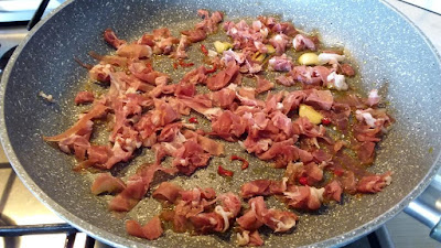 - Inserire anche lo speck tagliato a listelle e lasciarlo rosolare 1 minuto.
