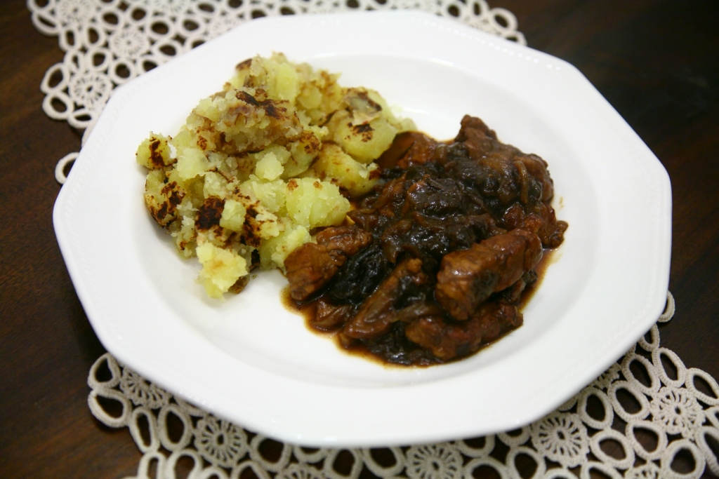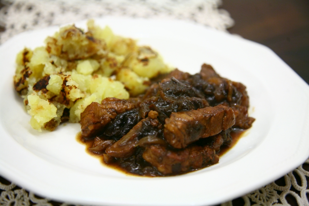 Servire con il sugo di cipolle e prugne e accompagnarlo con patate rosticciate alla tedesca o con patate al forno.