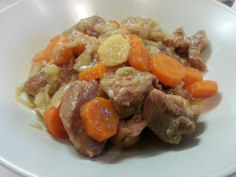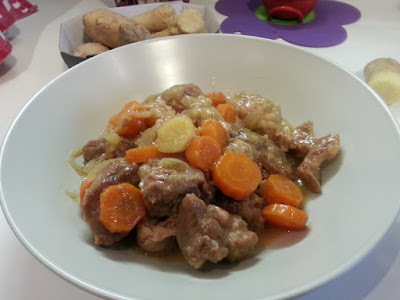 600 gr di spezzatino di vitello, 3 carote, una cipolla, un pezzo di radice di zenzero, farina, vino bianco, olio, dado vegetale granulare, pepe.