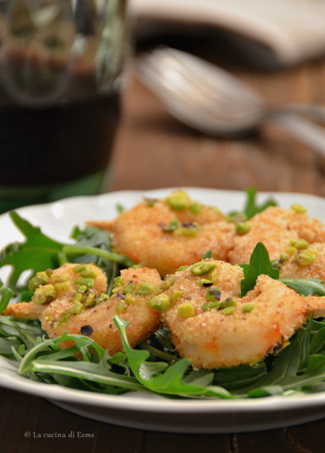 Lavate i gamberi, sgusciateli ed eliminate il filo nero, sfilandolo dall’estremità della testa. Sciacquateli e metteteli in un colino man mano che li pulite. Quando avrete finito questa operazione tamponateli leggermente con della carta da cucina e infilatene due per ogni spiedino. Mescolate il pan grattato con la granella di pistacchio, poi passate gli spiedini nella panatura premendo delicatamente. Disponete gli spiedini su una teglia rivestita di carta da forno, precedentemente spennellata di olio, irrorateli con un filo di olio evo e cuoceteli in forno in modalità areato a 180° per 10 minuti. Serviteli su un letto di insalata fresca.
