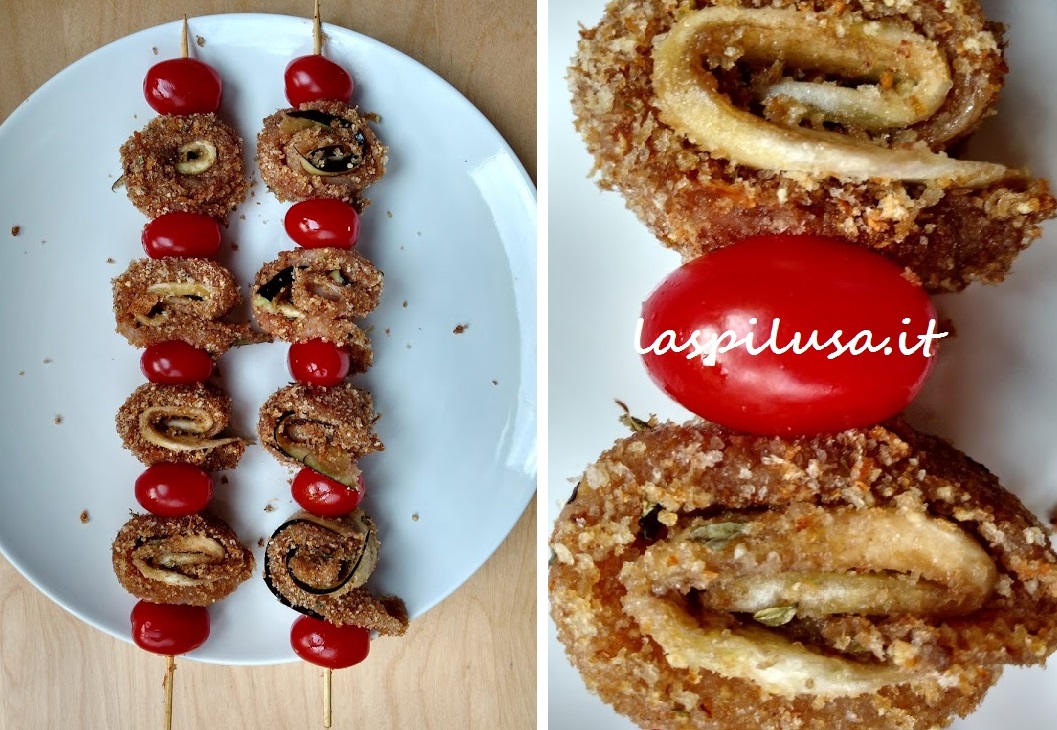 Passate un pezzettino di pollo nel pan grattato, stendete il pollo, ponete una fettina di melanzane, e arrotolate il pollo su se stesso.