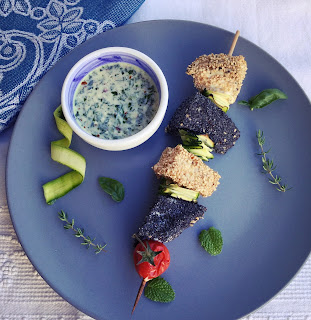 Preparare la salsina tritando tutte le erbe aromatiche con le mandorle e la scorzetta grattugiata di mezzo limone. Amalgamare le erbe aromatiche tritate con un paio di cucchiai di yogurt bianco, il succo di mezzo limone e un cucchiaino di succo di zenzero fresco.