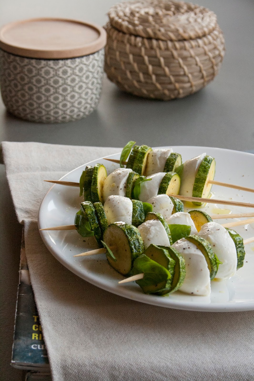 Successivamente comporre gli spiedini alternando i bocconcini di mozzarella alle rondelle di zucchina e alle foglie fresche di basilico.