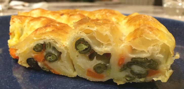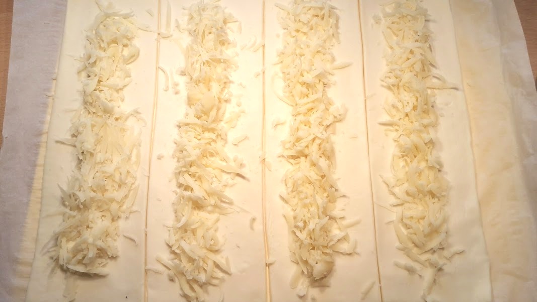 Disporre la pasta sfoglia sul tavolo di lavoro, stenderla un poco con il matterello, quindi tagliarla in 4 strisce uguali..