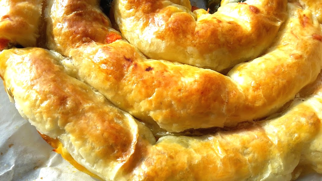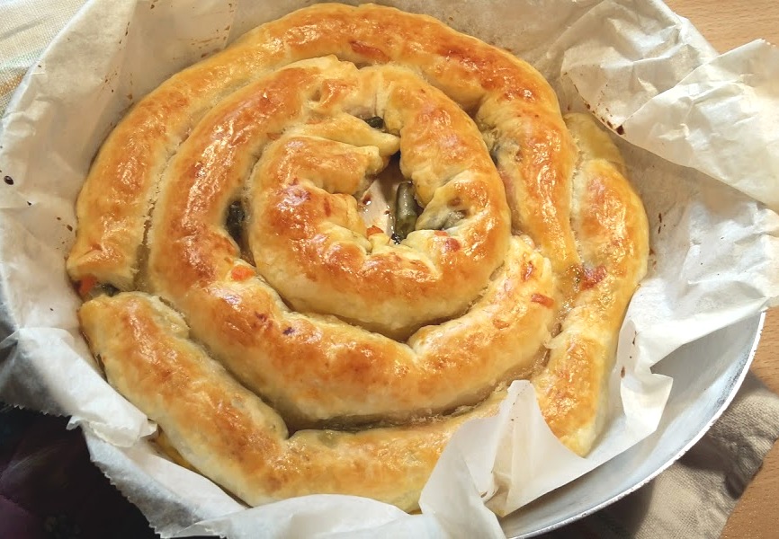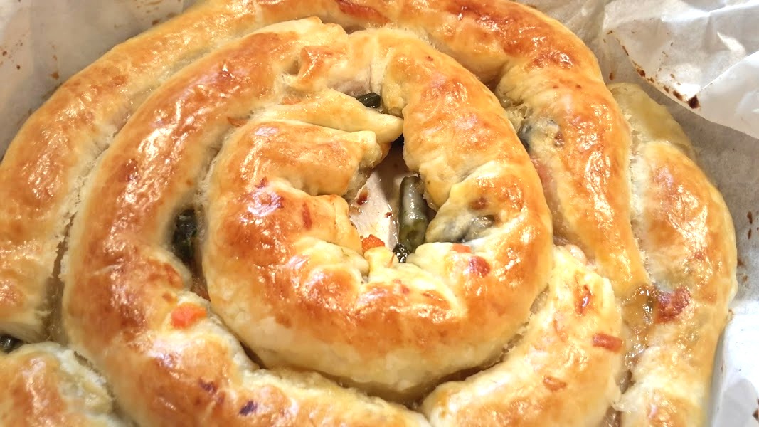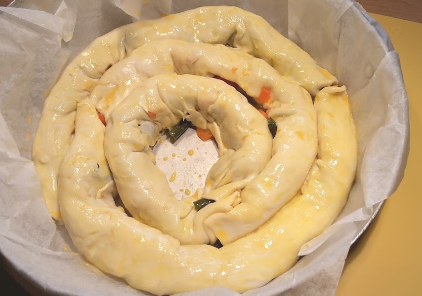 Disporre un foglio di carta da forno, bagnato e strizzato in una teglia del diametro ci circa 20 cm e sistemare i rotolini di sfoglia partendo dall’esterno uno di seguito all’altro…