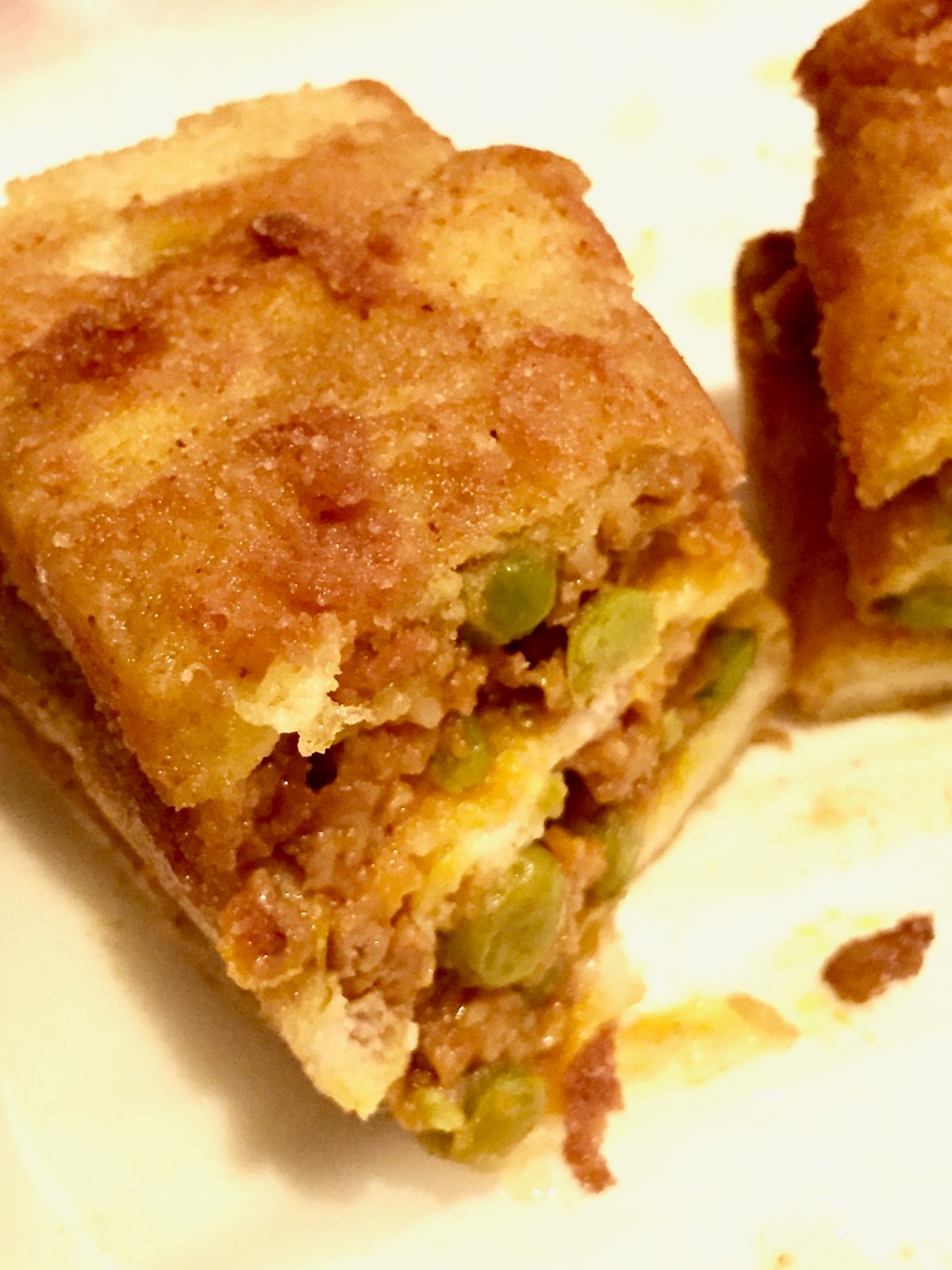 Quando avrete tutti gli ingredienti pronti, bagnare le fette di pane nel latte e preparare gli “spitini” infilzando alternativamente gli ingredienti (con stecche da spiedo in bamboo) in questo ordine: fetta di pane inumidita con il latte, una polpetta di ragù e altra fetta di pane. Alla fine lo “spitino” sarà composto da tre fette di pane alternate da due polpette di ragù.Accorciare le stecche di bamboo (potrete maneggiarli meglio), quindi passare gli “spitini” nella farina, poi nell’uovo battuto con un pizzico di sale e infine nel pangrattato. Procedere ancora ripassando gli “spitini” ad uovo battuto e, concludendo, nel pangrattato (doppia impanatura).