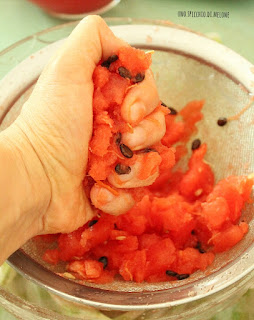 Preparare questa spremuta sarà facilissimo, non avrete bisogno né dell’estrattore né del frullatore. Vi basterà un’anguria, un coltello, un colino e…la vostra mano. :-)