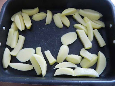 Tagliare a spicchi o a fette le patate e metterle in una pirofila da forno.