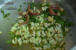 Tritare il sedano, il prezzemolo e l’aglio, mettere a soffriggere in un tegame di terracotta con due cucchiai d’olio,aggiungere le acciughe e i pinoli.
