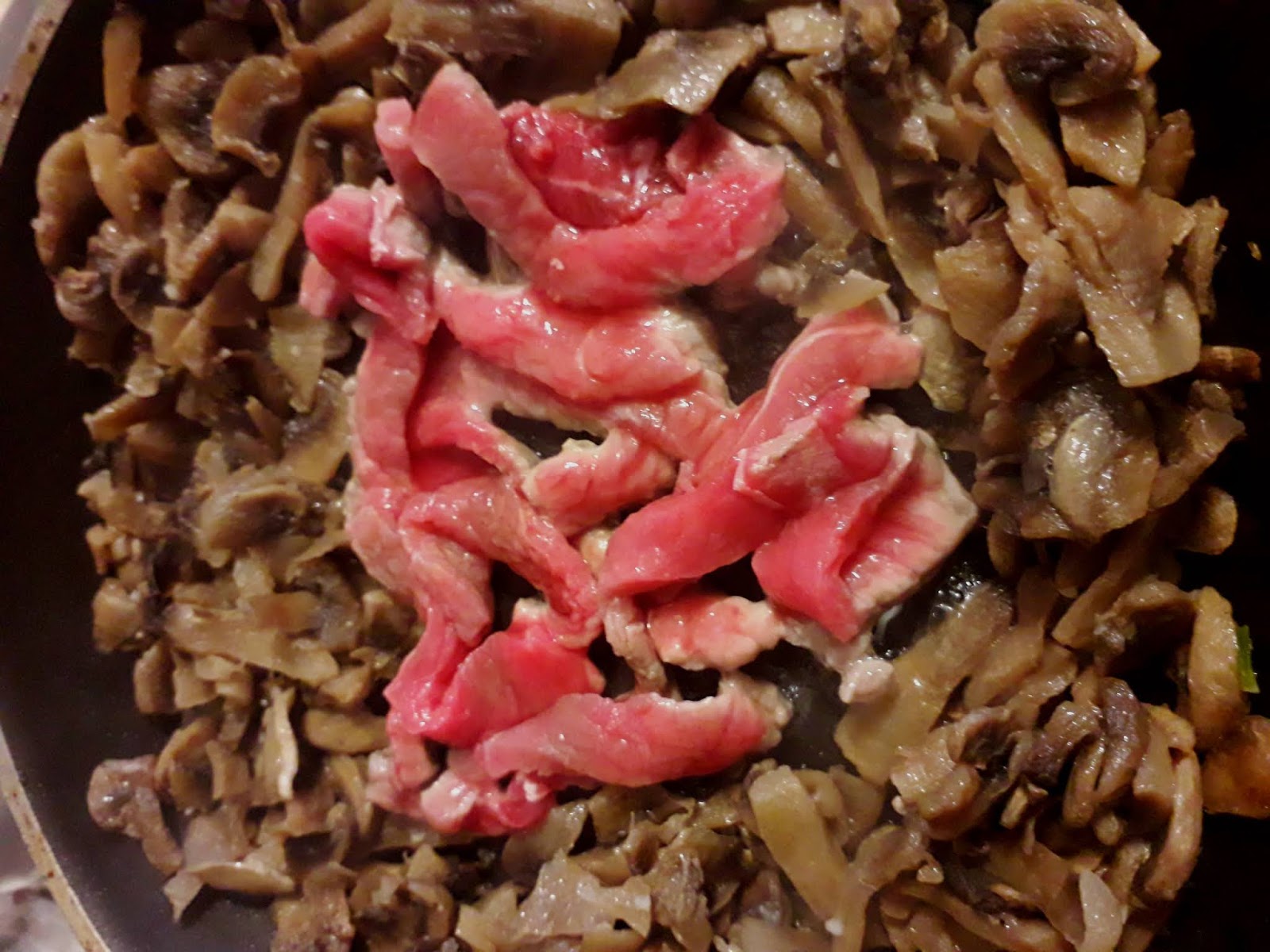 uno spazio nel centro del padellino, alzare la fiamma e versare la carne tagliata a fettine sottili,