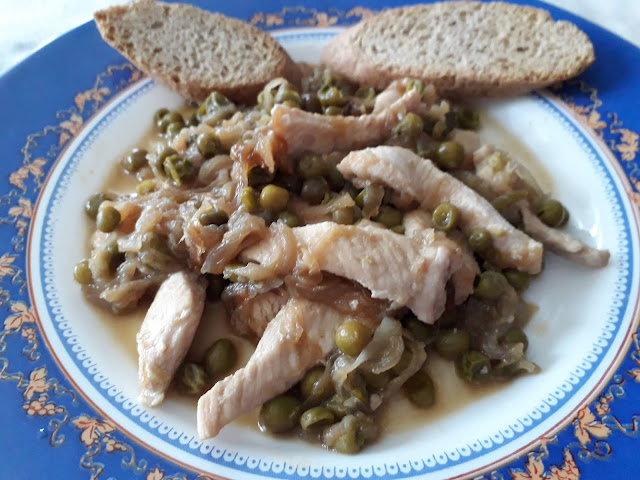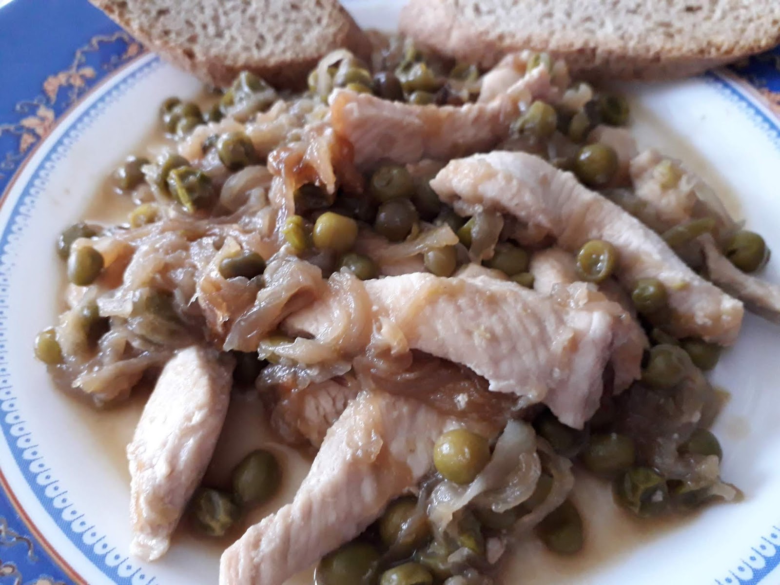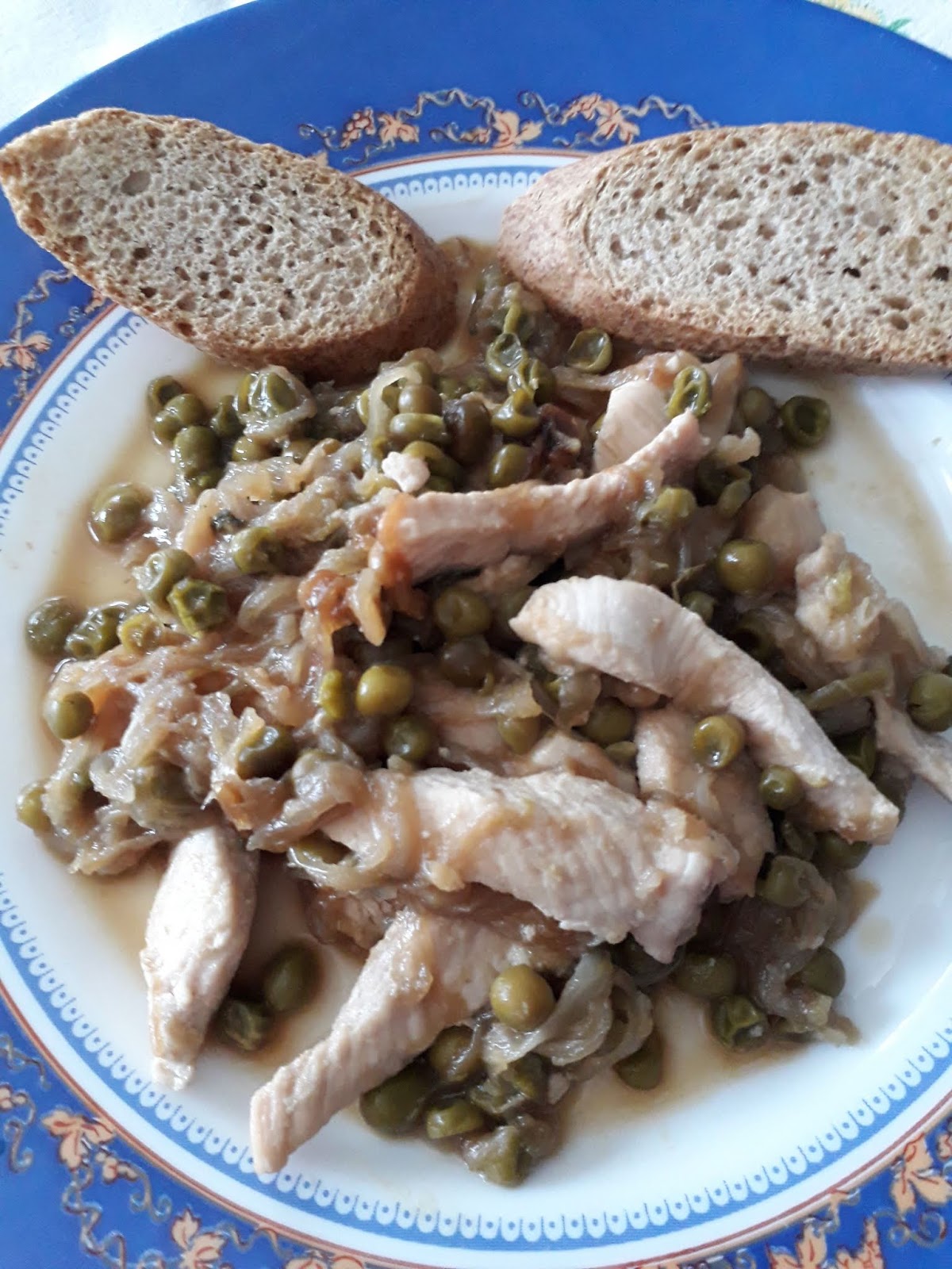 poi ho aggiunto i piselli ed ancora poca acqua sempre coperto per 7/8′ infine ho unito il pollo