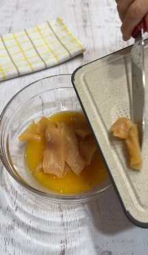 Per prima cosa, taglia il petto di pollo a fette spesse e poi a listarelle regolari, così da ottenere degli straccetti uniformi che cuoceranno in modo omogeneo.