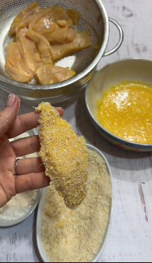 Trascorso il tempo di marinatura, scola accuratamente gli straccetti di pollo. Passali prima nella farina, poi nelle uova sbattute con il formaggio grattugiato e un pizzico di pepe. Infine, ricoprili completamente con il panko, premendo leggermente per far aderire bene la panatura.