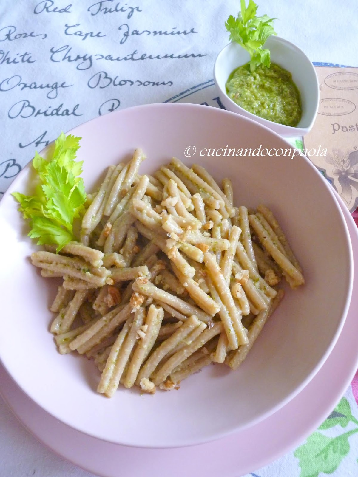 Prepariamo il pesto: puliamo il sedano, lo tagliamo a pezzi e
