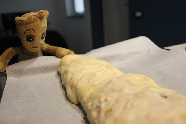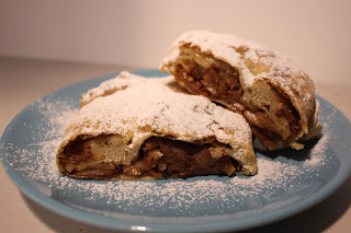 Mettete lo strudel su una teglia rettangolare foderata con carta forno e infornatelo a 180° per 40 minuti.