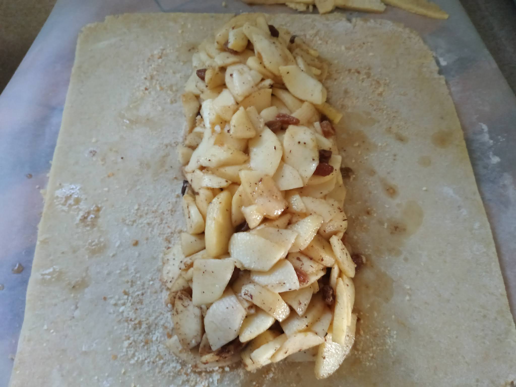 Stenderla con il mattarello, pareggiare i bordi creando un rettangolo. Sistemare al centro il ripieno. Un segreto è quello di mettere prima del ripieno delle briciole di biscotti o anche del semplice pangrattato: in questo modo il liquido rilasciato dalla frutta verrà assorbito e non farà rompere l’involucro di pasta.