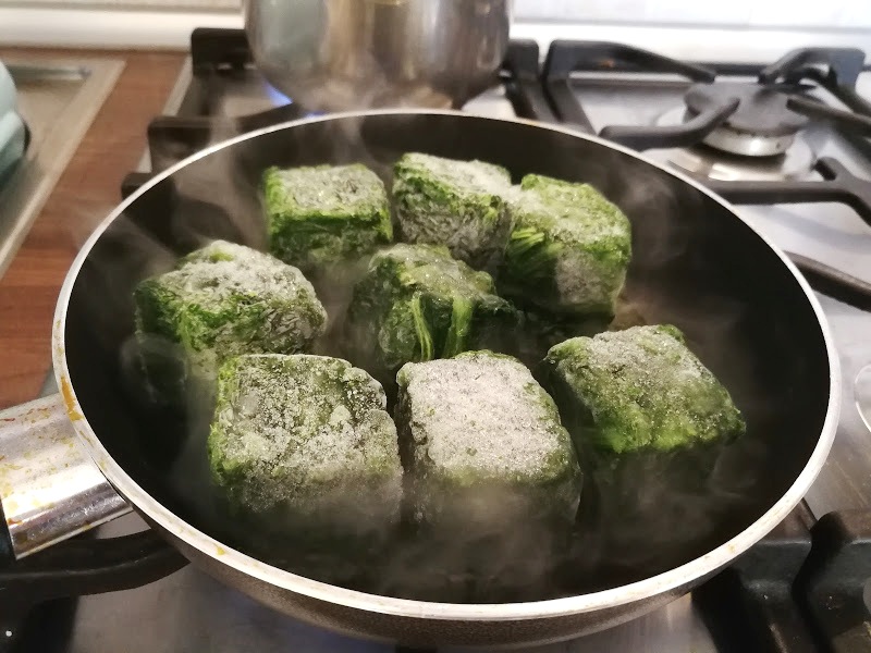 Se si usano gli spinaci surgelati a cubetti basta porli in un tegame antiaderente e farli scongelare, unendo una lacrima d’acqua, rigirandoli spesso…